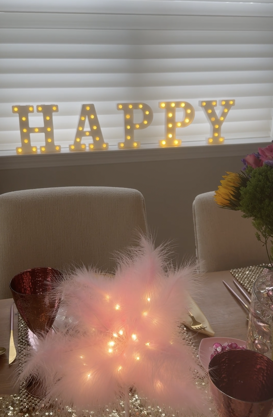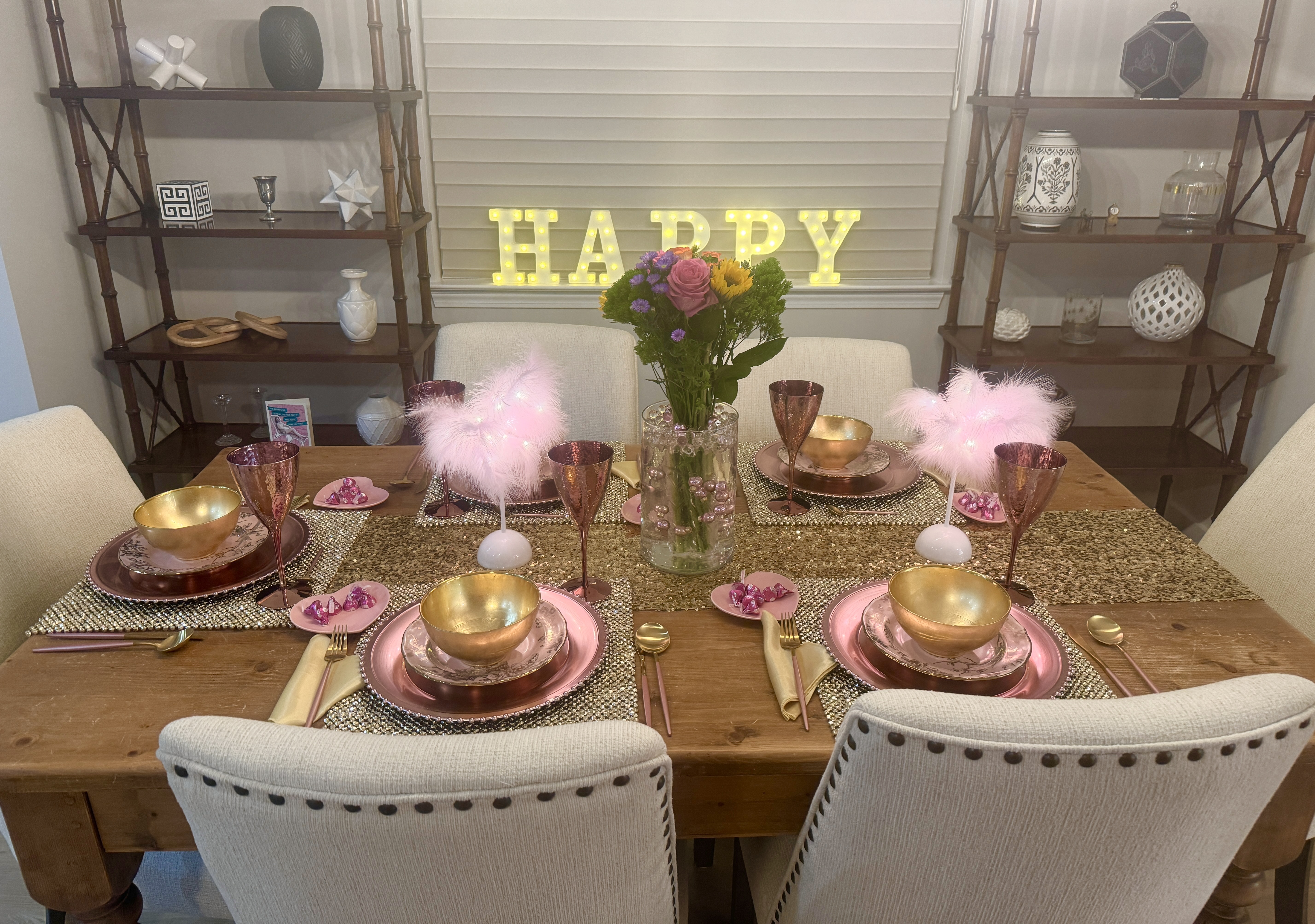 Pink chargers paired with pink and gold floral dessert plates created a cohesive  color theme, while gold bowls and pink goblets added a touch of elegance to the dessert display. At the center of the table, a flower vase with floating pearls brought an extra layer of detail, making this setup visually stunning and memorable. The special birthday gal and her friends were delighted by these thoughtful touches by Tara’s Tables.