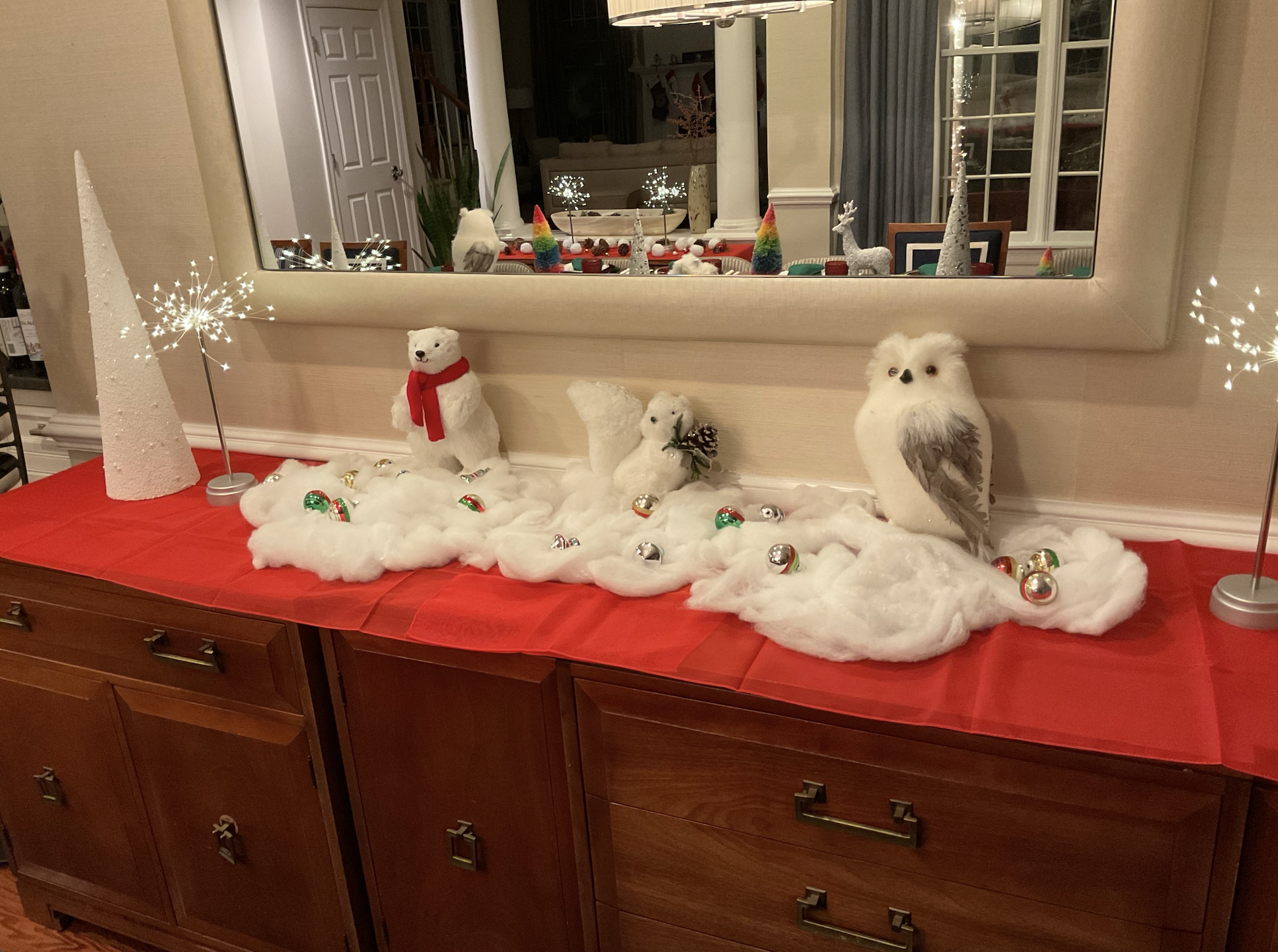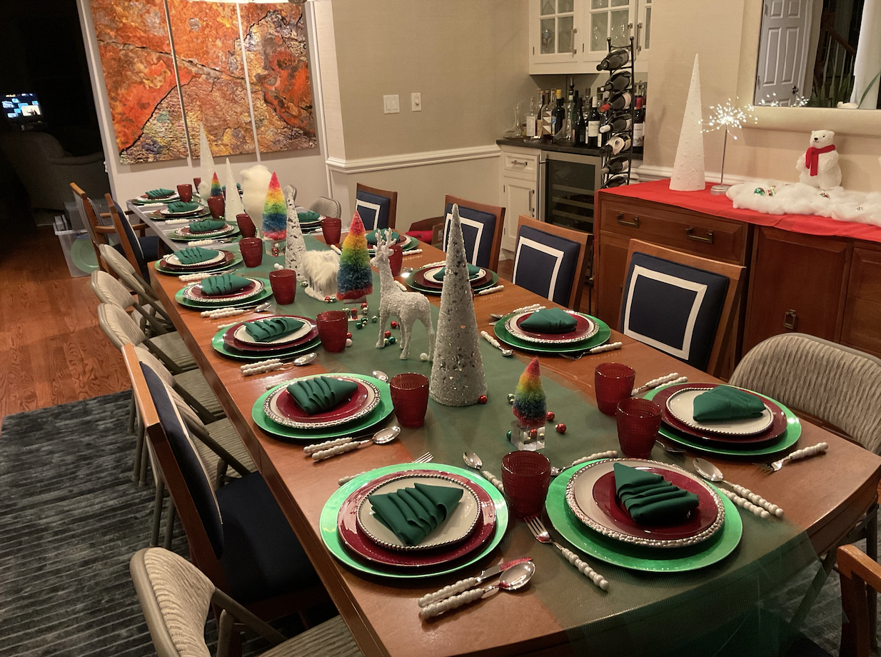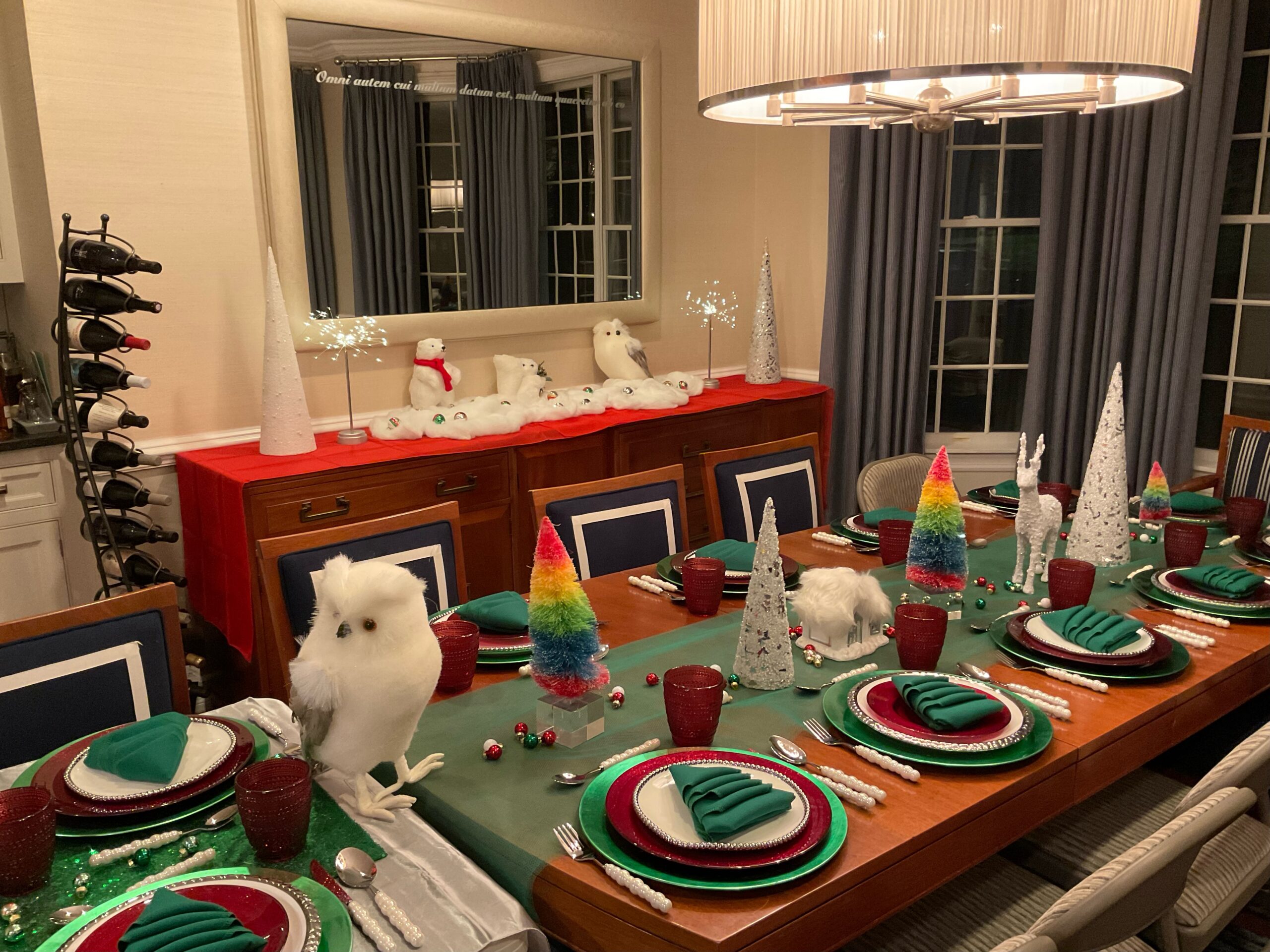 Each place setting was accented with a charming green napkin folded into the shape of a Christmas tree. The winter-themed decor on the table included whimsical elements such as sparkling reindeer, snowy white animals, and colorful trees that brought a burst of holiday spirit to the scene.