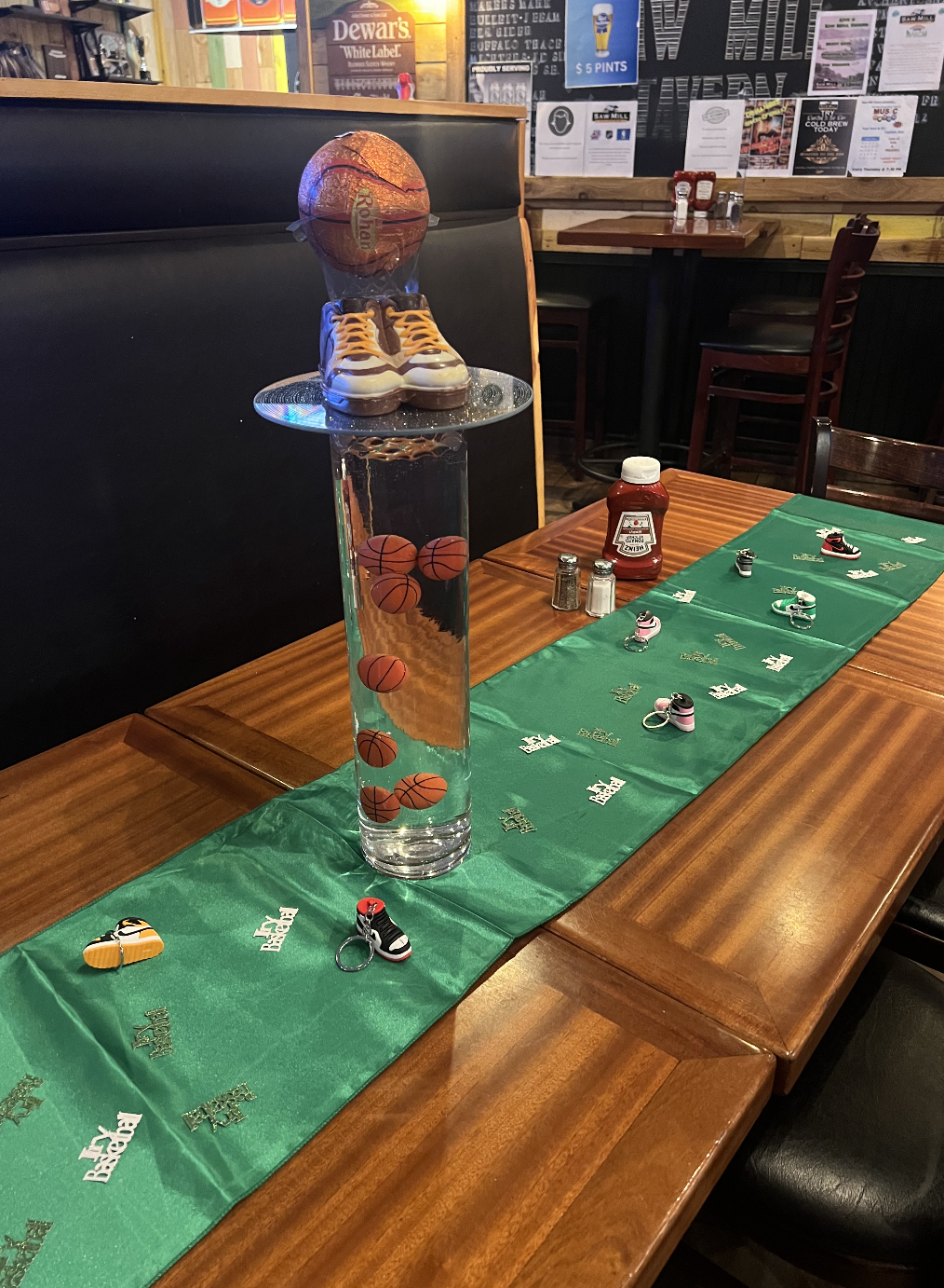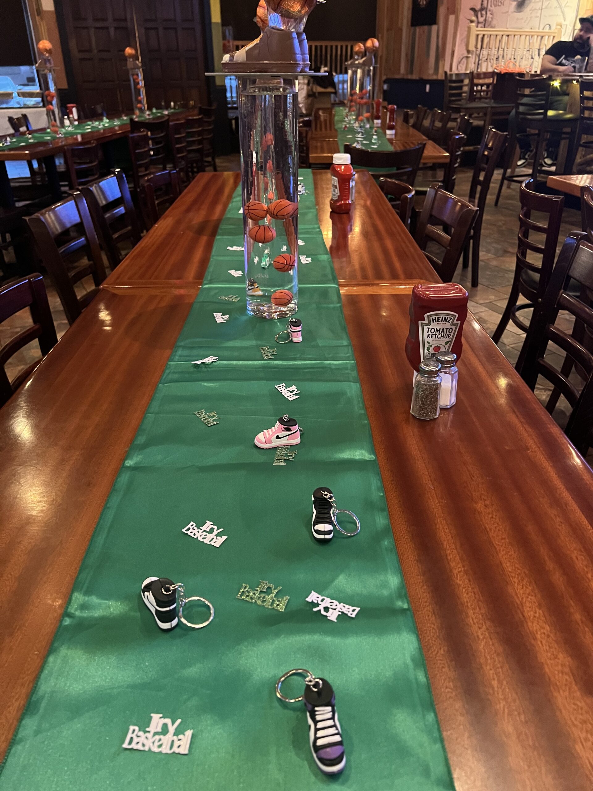 This end-of-season banquet for the Irvington High School Boys’ Basketball team was a celebration of hard work and team spirit, held at a local tavern. Tara’s Tables wanted to elevate the atmosphere to match this festive occasion. By adding green table runners and custom confetti to the tavern’s wooden tables, they were able to do just that!