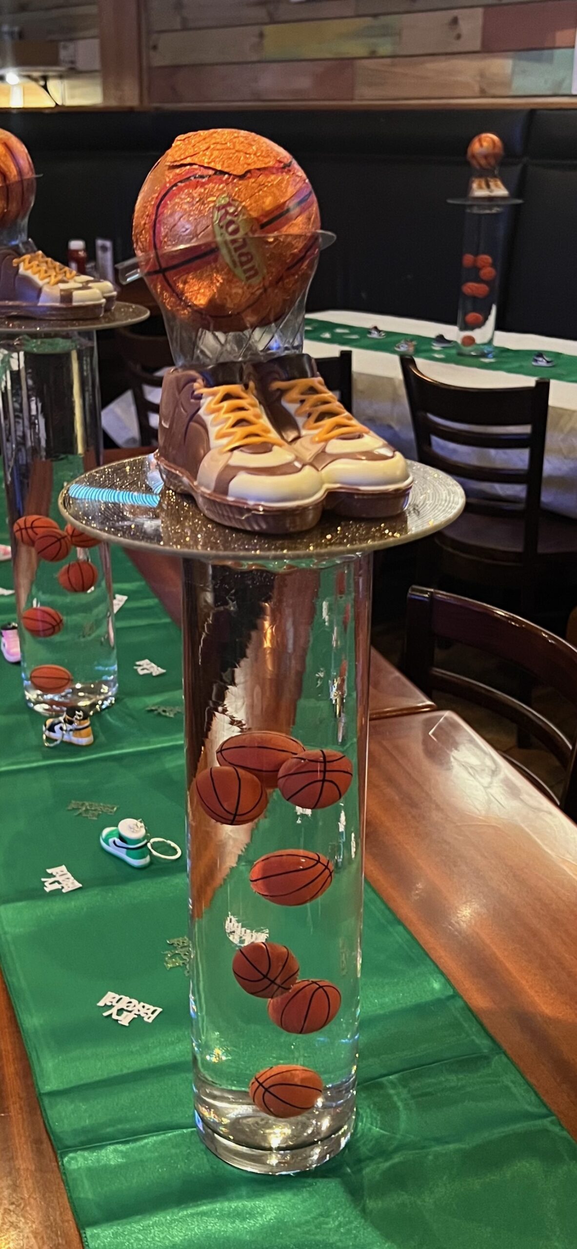The centerpieces, vases with floating basketballs, had everyone talking. On top of the vases, Tara used chocolate shoes and basketballs, which not only added to the decor but also served as thoughtful gifts for the seniors to take home. This banquet decor added to making it a night to remember for the team and their supporters.