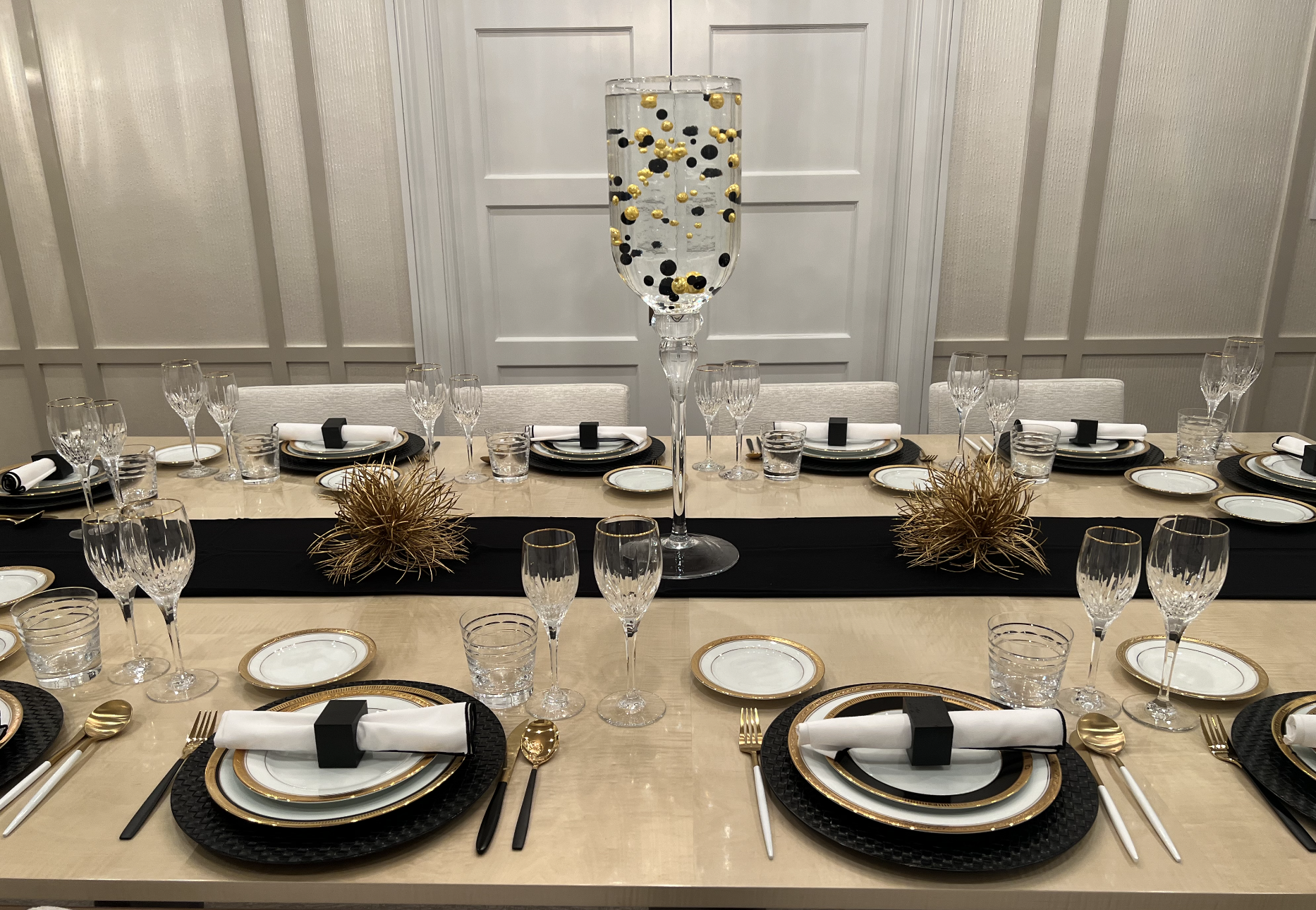 This New Year’s Eve dinner table was a sight to see! Black and gold accents, beautifully contrasted against the soft, neutral tones of the room, made for an elegant celebration. The table was beautifully set, with every detail carefully chosen to create a festive and glamorous atmosphere.