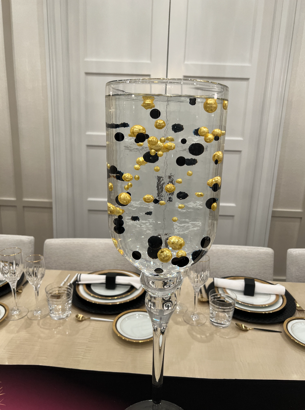 At the heart of the setup was a stunning, oversized and eye-catching vase with floating gold and black spheres. The table was further decorated with a rich black table runner, with hints of gold. To further enhance the ambiance, crystal glassware and minimalist black and gold flatware were placed on the table. Black and gold made this dinner party an unforgettable start to the new year.
