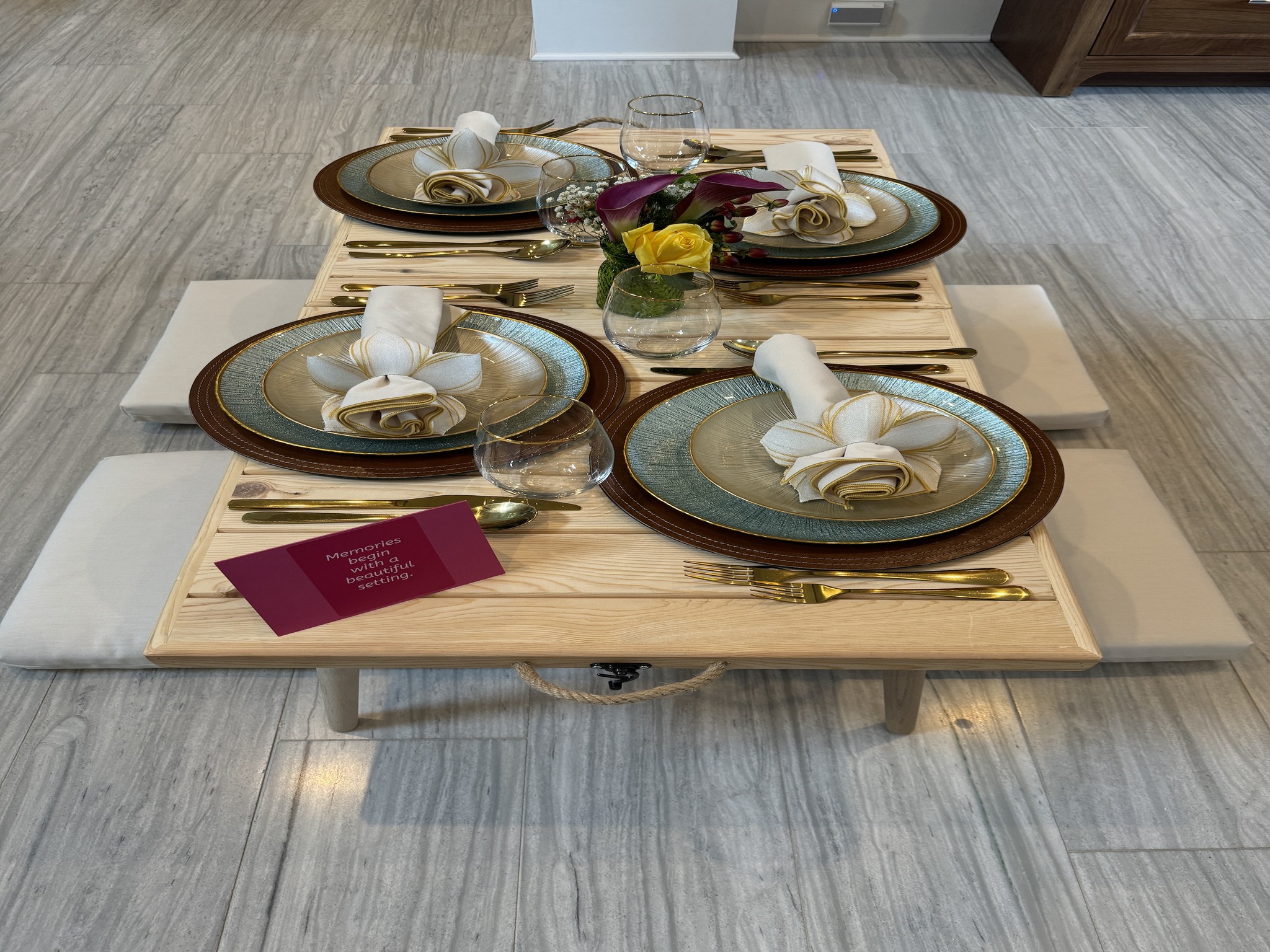 Give someone a special housewarming gift that includes a foldable picnic table set with beautiful long-lasting place settings. Service includes setup and customization for the receiver. Prices starting just at $350.